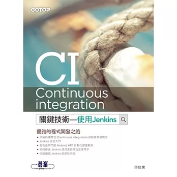 CI (Continuous integration) 關鍵技術:使用 Jenkins購買網址:http://www.books.com.tw/exep/assp.php/87926/products/0010596579?utm_source=87926&utm_medium=ap-books&utm_content=recommend&utm_campaign=ap-201609